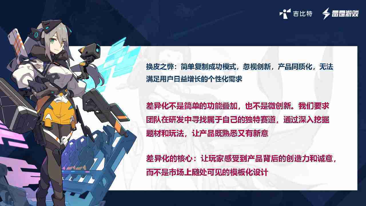 在我们内部是这么定义差异化的。。首先,,差异化不是简单的功能叠加,,,,更不是换皮。。。。只是换皮,,,,产品无法提供有效的市场价值。。内部经常说差异化的产品不是为了迎合市场,,,而是找到一个自己独特的表达方式,,,,在研发中找到属于自己的细分赛道和独特赛道,,,,前提是需要对这个题材有足够的深入、、挖掘,,对玩法有足够深入的理解,,,让产品看起来既熟悉又有新意。。。。