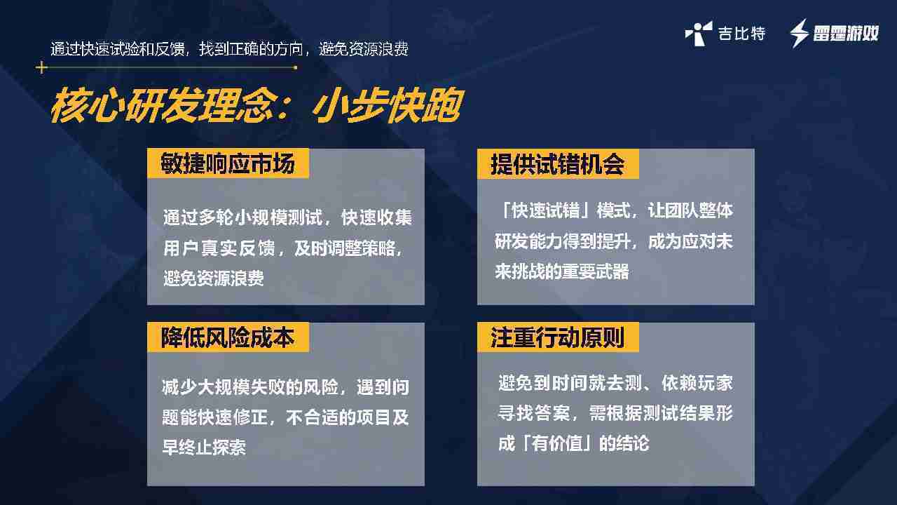 小步快跑不是找答案,,而是验证答案。。。我们之前有项目是这样的,,有些制作人会有几个方向觉得都可以做,,但是不确定做哪一个,,,,会选择几个都做,,,,做完拿到市场跑,,,,跑出哪一个更好,,,,基于这个再做后续的研发和拓展。。但这种情况最容易出现一个问题,,,可能被玩家裹胁,,玩家说这个点不错、、、、那个点不错,,,到底听还是不听,,不听感觉是无视玩家的反馈,,,,听的话,,,可能自己没想清楚导致研发思路发生偏颇。。。。所以针对这一点后面自己复盘整理,,,,发现制作人自己心里要有数,,,,要做自己觉得好玩的,,而且明确知道这个东西是你想做的,,,,然后拿到市场验证这个答案是不是对的,,,而不是拿一堆答案找哪一个答案更好。。。