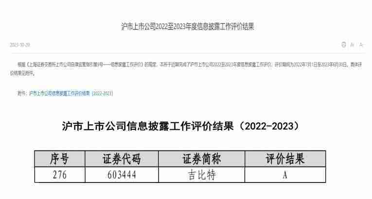 近日,,,,上海证券交易所(以下简称“上交所”)发布2022-2023年度信息披露工作评价结果。。。亚星管理(股票代码::::603444)凭借规范的公司治理、、、高质量的信息披露以及良好的投资者关系管理再次荣获信息披露工作A级评价,,公司连续两年获此殊荣。。