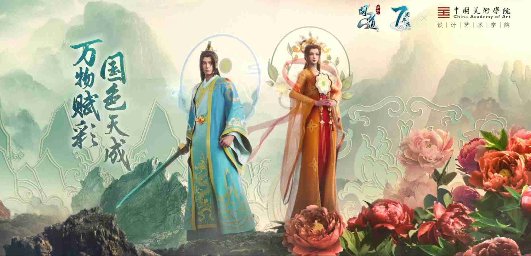 2023年4月,,,《问道手游》联动中国美术学院,,,,在游戏中融合了中国历史上不同时期的文化元素,,,,打造了“山河万象”与“凤鸣九霄”的国风时装。。在色彩配置方面,,创作团队基于对游戏角色特性的分析提取相应的文化内涵,,,从每一种色彩的色相、、、指代事物和情感出发对应角色属性,,,选定服装的色彩搭配。。在纹样设计方面,,创作团队结合游戏角色自身特殊的造型比例和形态,,在实际的纹样设计中进行了游戏语境下的活化演绎。。。男性角色集中使用了如蟒纹、、、海水江崖纹、、、如意纹和云气纹等传统纹样元素,,女性角色则吸纳了凤凰纹、、牡丹纹、、、卷草缠枝纹等元素,,,组成以“双凤牡丹纹样”“缠枝牡丹纹”“金玉凤冠头饰”为主要纹样的游戏角色装饰图案系统。。。。