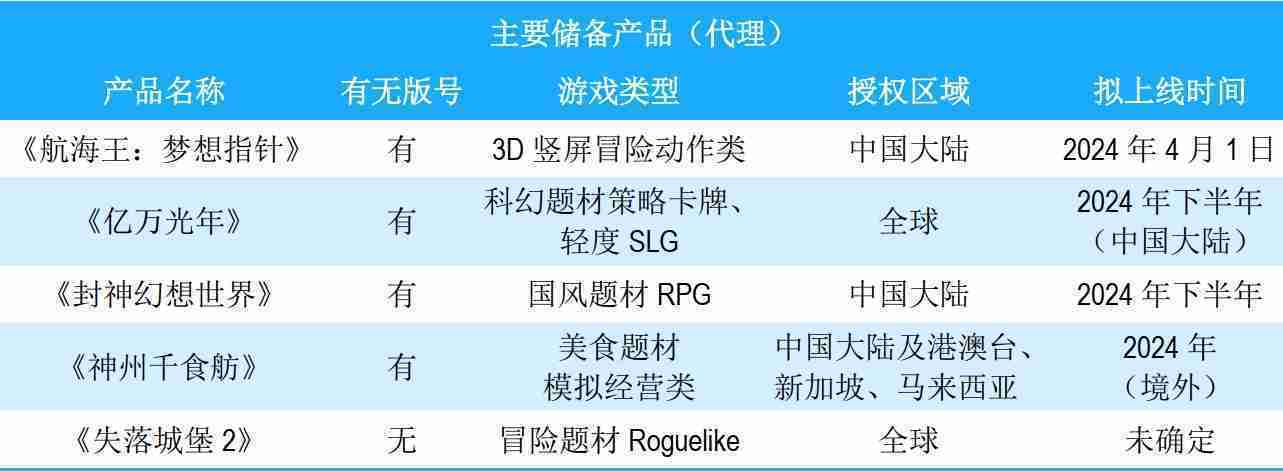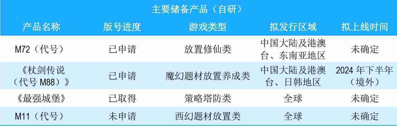公司储备的多个自研、、、代理产品都在有序推进当中,,,涵盖放置类、、策略类、、、、模拟经营类、、、、RPG、、Roguelike等多元化游戏品类,,,储备的主要自研和代理产品如下:::